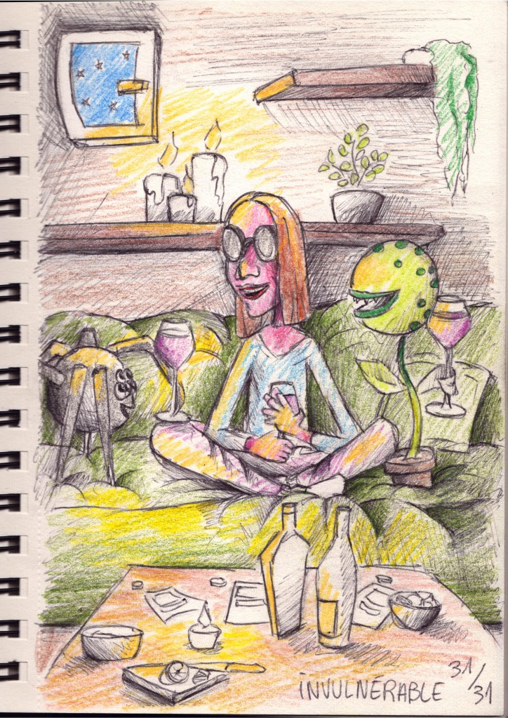 Inktober 2024 Tout droit réservé Jour 31 – Invulnérable Jour 28 – Transparent.e Jour 27 – Baguette Jour 24 – Breuvage Jour 23 – Cocon Jour 17 – Bloc Jour 16 – Etreinte Jour 14 – BOOM! Jour 13 – Sac Jour 11 – Hanté.e Jour 10 – Ouvrage Jour 9 – Dupliqué.e Jour 8 – Au-dessus Jour 7 – Chaos Jour 6 – Grenouille Jour 5 – Bouteille Jour 4 – Chamarré.e Jour 3 – Enchevêtrement Jour 2 – Escapade Jour 1 – Vulnérable