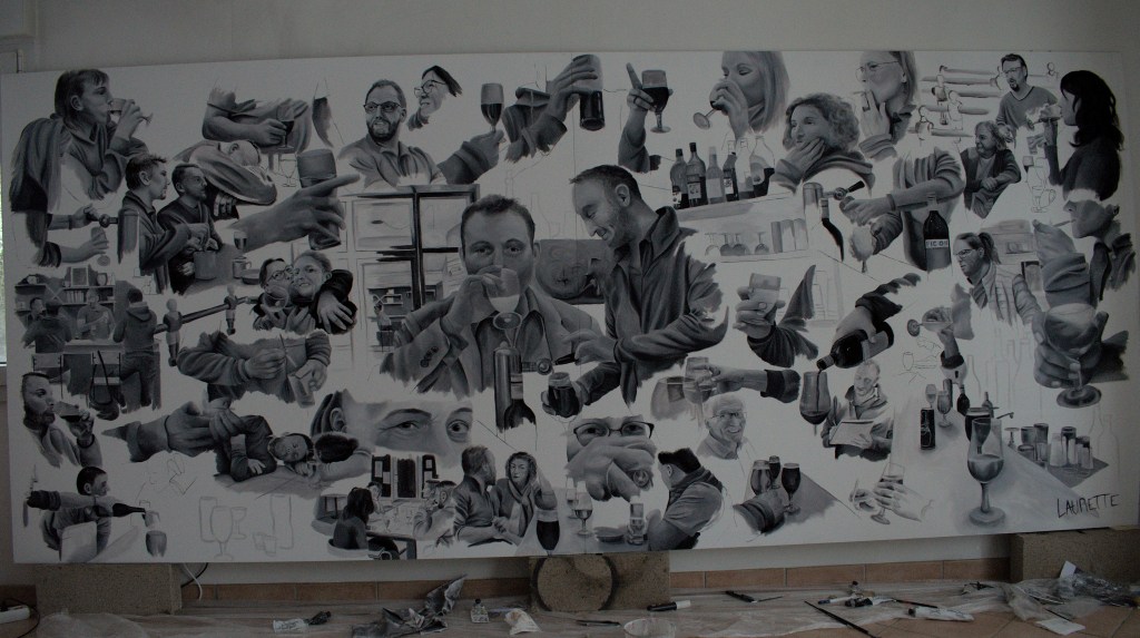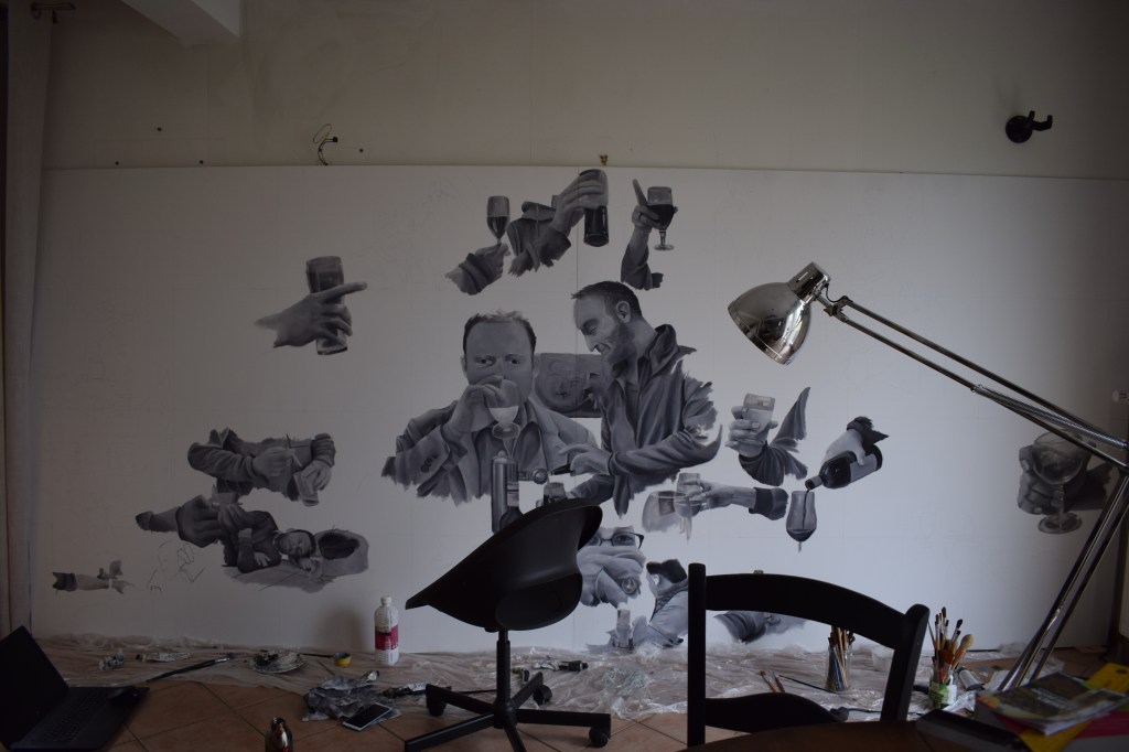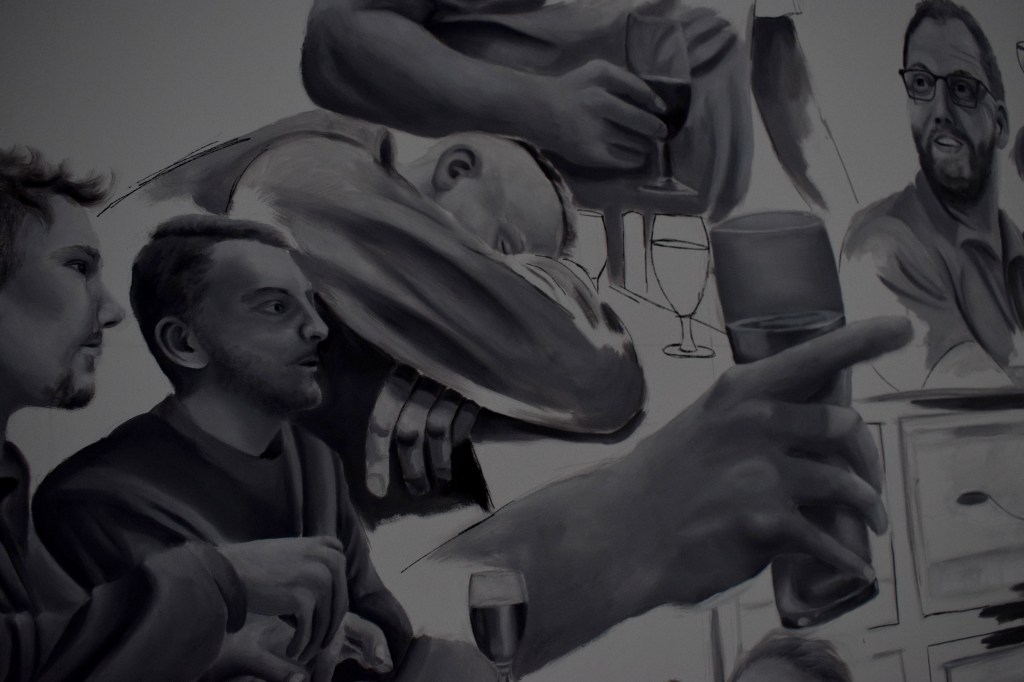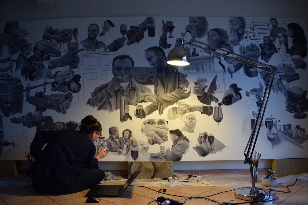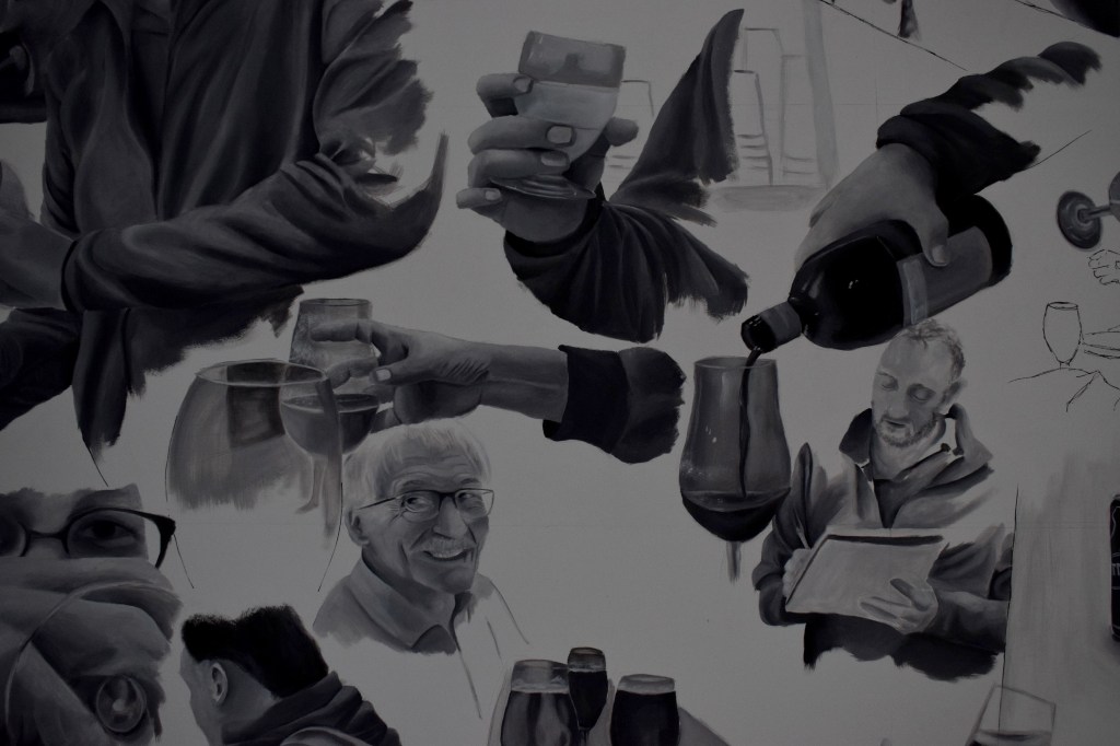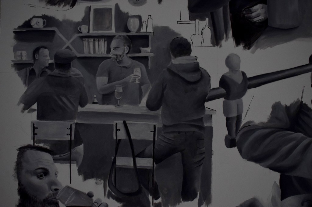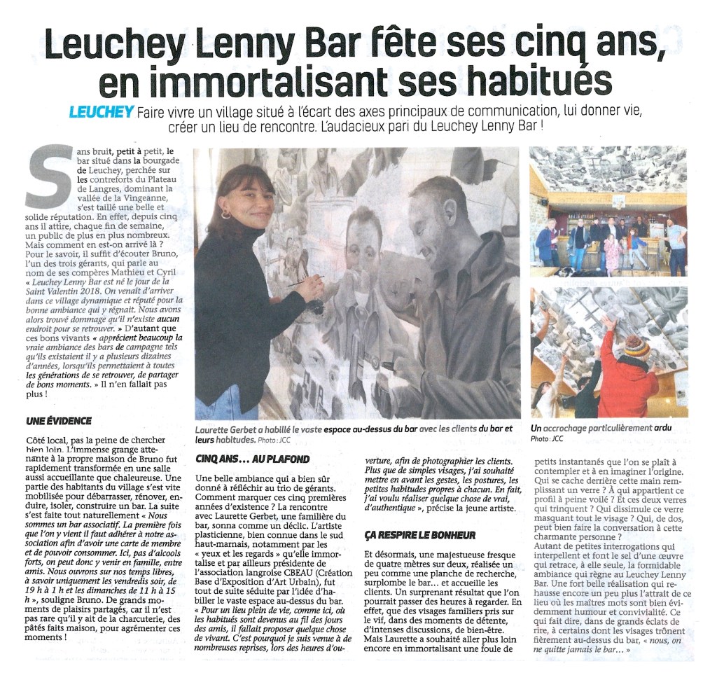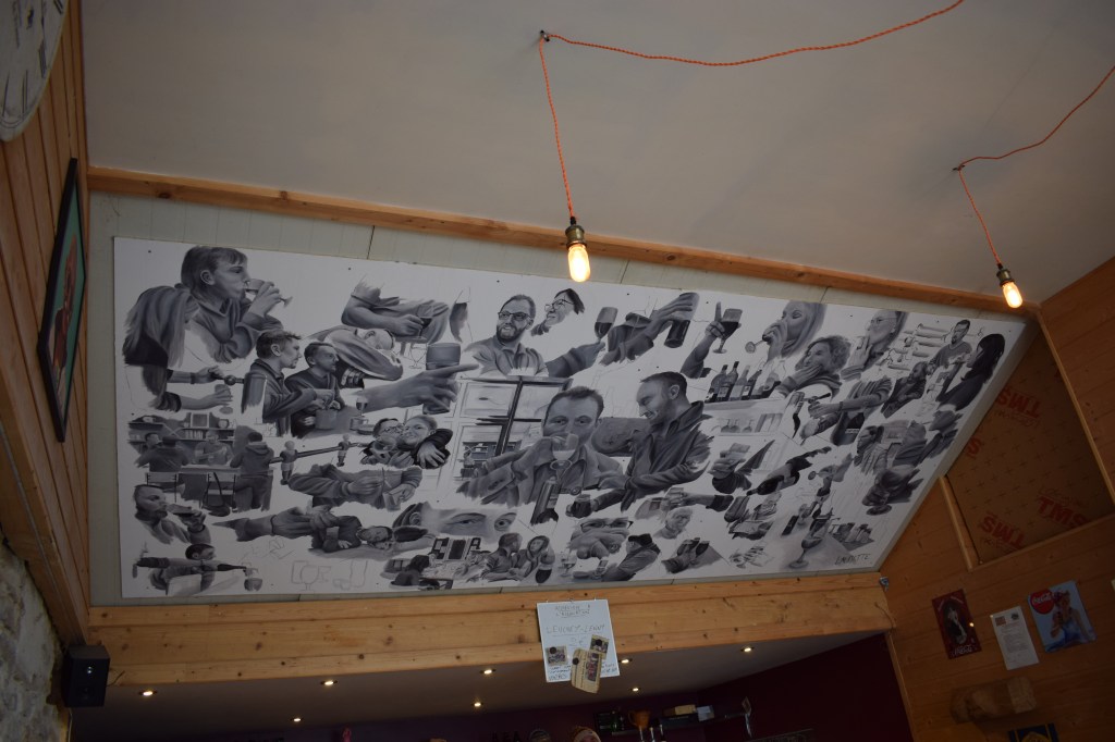 Situé dans le village de Leuchey en Haute Marne (52), le Lenny Bar et un bar associatif pour lequel j’ai réalisé une fresque. Ayant carte blanche sur une surface d’environ 400 x 180 cm, j’ai décidé de tenter de retranscrire l’ambiance conviviale du bar avec une réalisation semblable aux planches de recherches artistique.